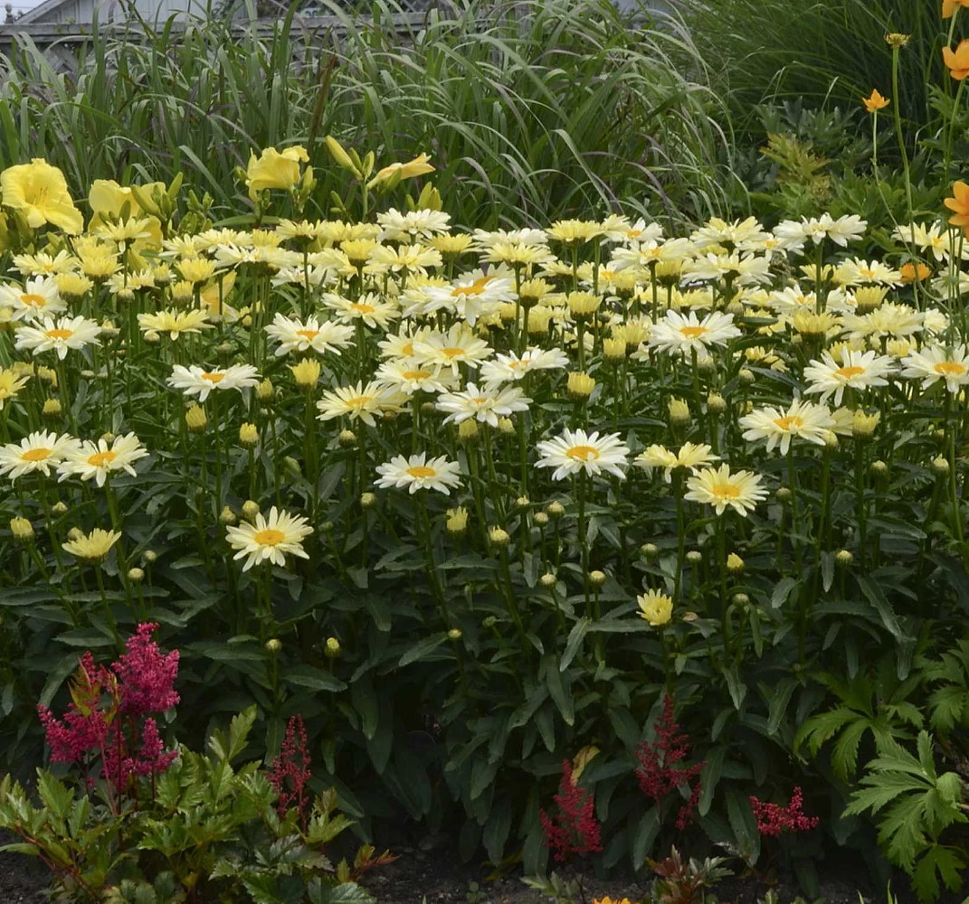 Destined to be the workhorse of your cutting garden, ‘Banana Cream’ is a super-floriferous, long-blooming Shasta Daisy with flowers that begin bright lemon-yellow before maturing through all shades of pastel into ivory cream! A fully blooming plant is a breathtaking sight, and the flowers last 2 weeks or more in the vase, assuring you of months of beautiful indoor arrangements! Measuring 4 inches across, these blooms are technically semi-double, an extra layer of petals beneath the first adding depth and still more color to the display. The long, slender, very crowded petals surround a merry golden-orange center on thick, sturdy stems. Even the side-shoots bud heavily on ‘Banana Cream,’ provided the first blooms of the season are cut or deadheaded promptly. The bloom season begins in late spring in most climates, continues through summer, and even trickles into autumn. That’s an incredible span for any plant, and much longer than most Shastas! Butterflies pay homage to ‘Banana Cream’ throughout it all, adding further bright color to the display. ‘Banana Cream’ reaches 15 to 18 inches high and 18 to 24 inches wide, with dense branching and dark green, healthy foliage held below the blooms. Far more disease-resistant than older varieties, this perennial asks little more than direct sun and fertile, well-drained garden soil to thrive and multiply over time in the garden. Plantsman Kevin Hurd introduced ‘Banana Cream’ in 2009, and we are pleased to be among the first to offer it to home gardeners. We believe it is thoroughly dependable in a wide range of climates and conditions. Zones 5-9.