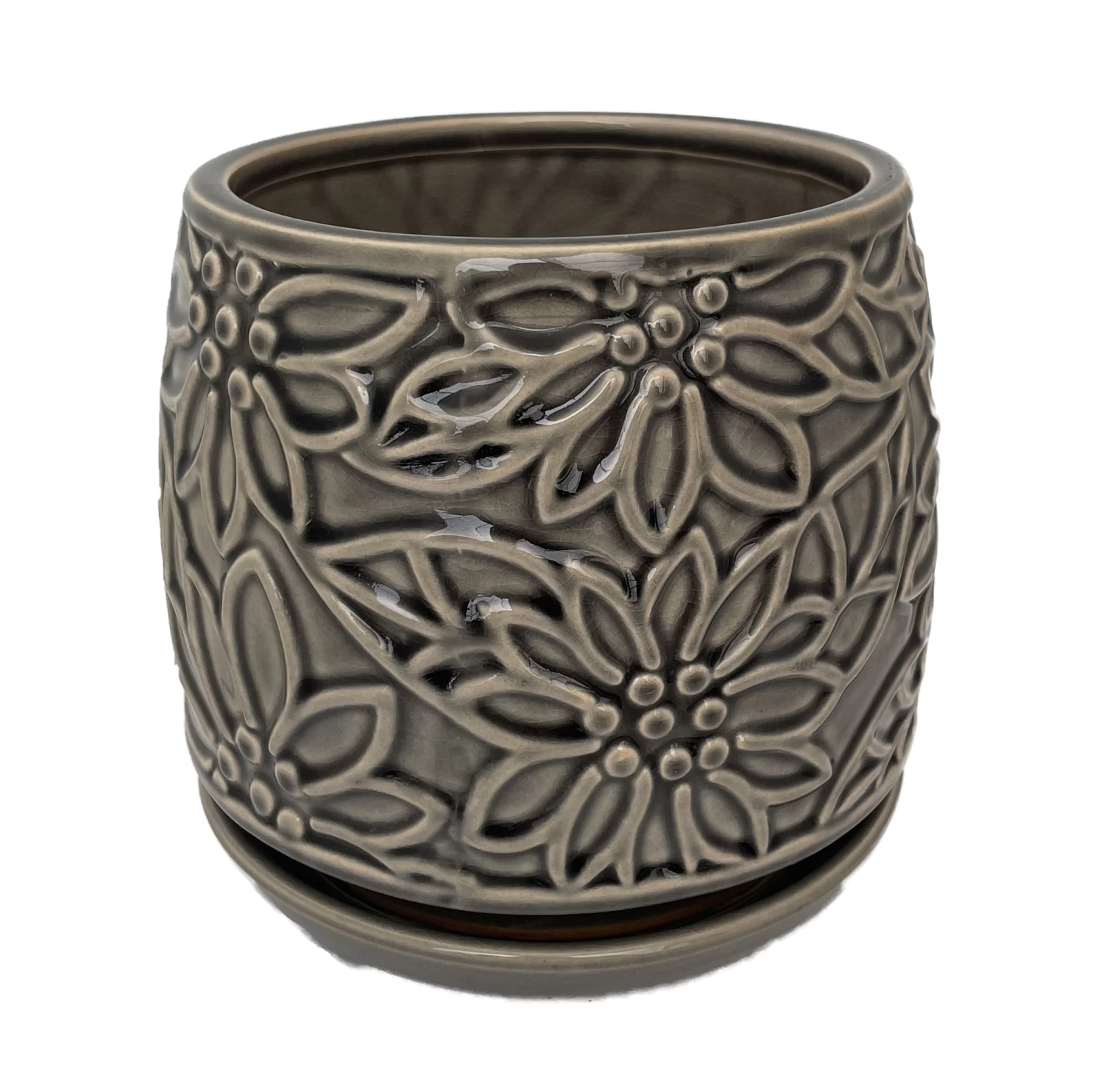 Floral textured design, glossy finish, functional pot with an attached saucer. One center drainage hole.