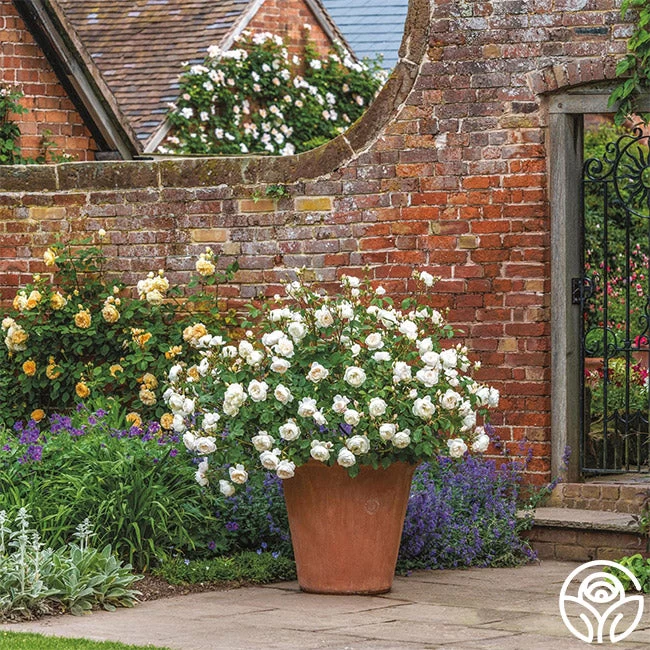 What sets this rose apart is its lovely fragrance. The strong Old Rose scent carries hints of almond blossom, cucumber, and lemon zest, making it a sensory delight. With its neat, rounded, and bushy shrub form, it’s a perfect choice for borders and hedges. Its compact size also makes it well-suited for containers, offering versatility in garden design.