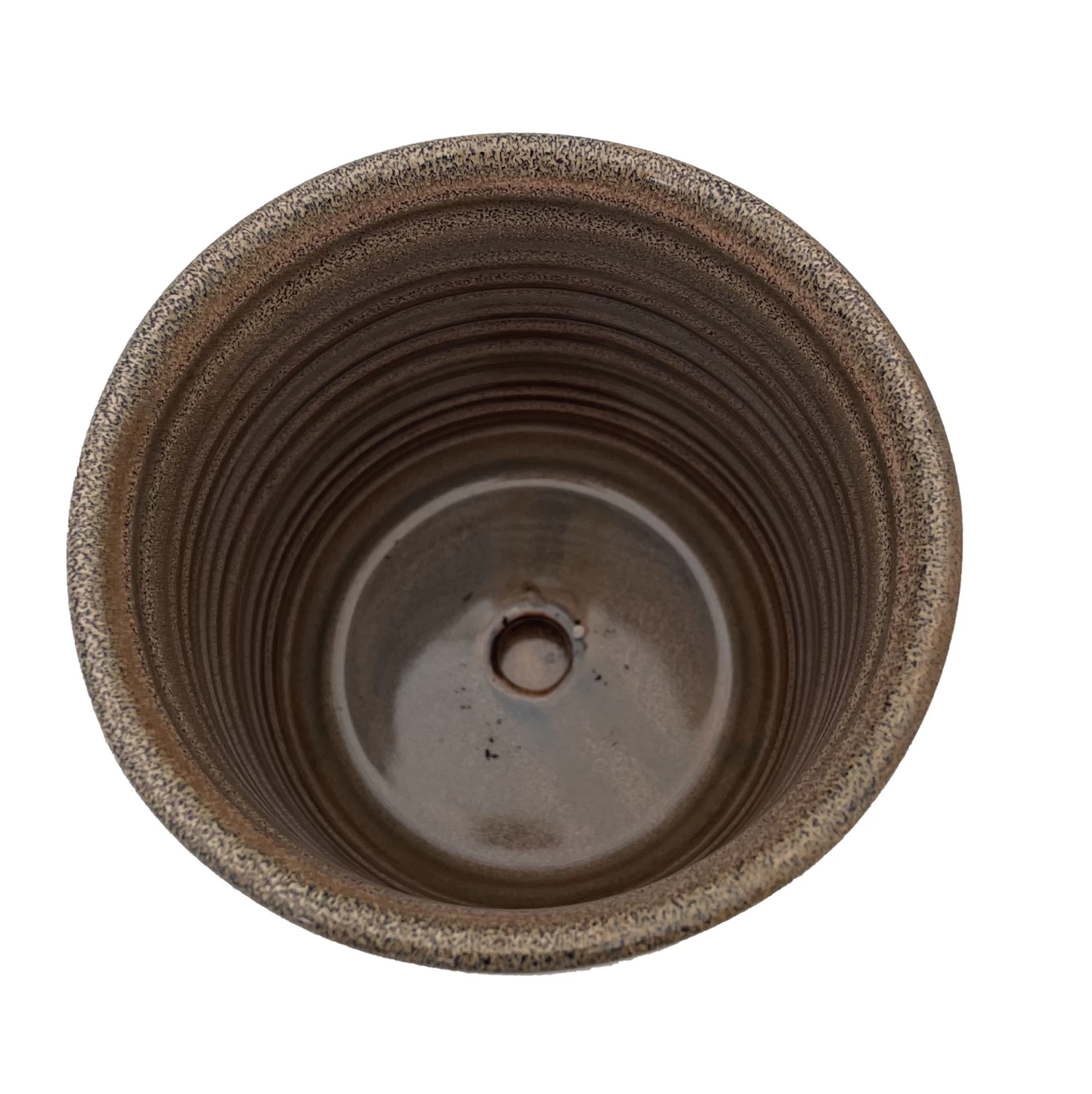 Heavy glazed ceramic pot with attached saucer has a cozy taupe/brown shiny ribbed finish. One drainage hole, attached saucer and foam pads on base to prevent scratching.