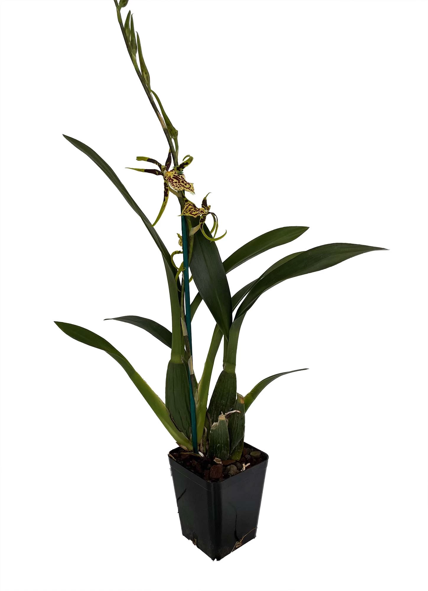 Banfieldara (Bnfd.) Gilded Tower also recognized as Brascidostele (Bcd.) Gilded tower (Brassostele Summit x Brassidium Gilded Urchin) produces bright, eye-catching green blooms! This hybrid pops with color! When in bloom, this orchid shows off 5″ star-shaped flowers that first open with a greenish color, then progress to being more yellow as the flowers mature. The petals and sepals have chocolate-red markings and the lip is a maze of red vertical striations through the lip. Long lasting flowers borne on 24″ tall spikes with 10 or more flowers. This plant will flower twice per year. Blooming Size.