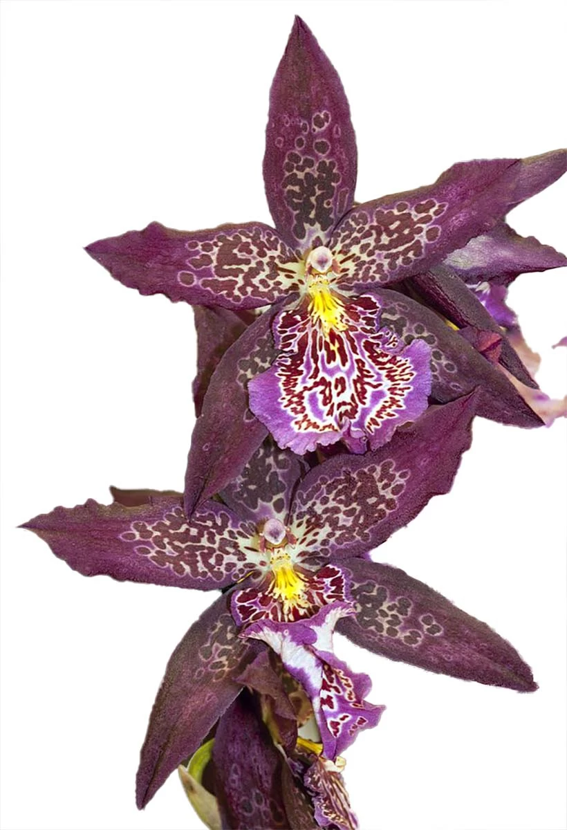 A mericlone of one of the best intergeneric Oncidium hybrids. These plants get very tall flower spikes and produce 7 to 12 flowers per spike on average. Very large, deep grape-purple colored flowers make for a showy plant. The flowers measure at about 5 inches across. Beautiful plants! Grow in cool, intermediate, or warm temps, allowing the potting mix to approach dryness between watering. Prefers medium light levels. Purplish colors in the leaves and pseudobulbs are normal for this plant.