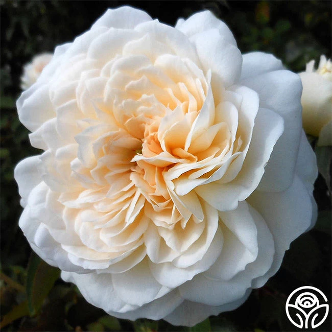 Heirloom Roses was very proud to name this exceptional Shrub rose of our own hybridizing efforts in honor of the elegant star from the golden age of movies, Joan Fontaine. The wonderful, fragrant 4” blooms with 75+ begin with buds of soft, flesh pink and open to a creamy white with a glowing touch of amber in the center. The fully double, English-style flowers are carried on a striking, continual blooming plant with deep-green foliage.