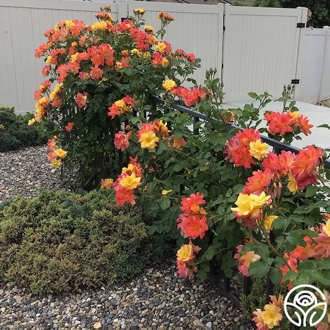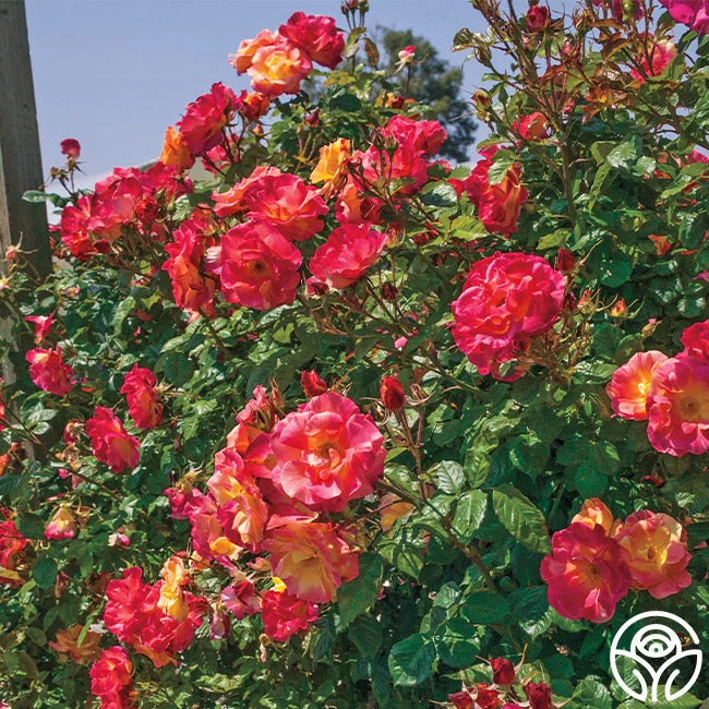 TOP SELLER! This Climber makes a great addition to a cutting garden, and it can be grown as a large climber or as a shrub. Josephās Coat produces medium sized, semi-double, 4″ blooms with 12+ petals of cherry-red, deep gold, and orange. He is an upright, hardy, continually blooming plant with dark-green, glossy foliage. Brighten up your garden with the many colors of Joseph’s Coat, and youāll soon see why he is a top seller!
