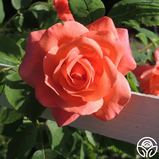 Leaping Salmon produces huge, double, salmon colored, 4″ blooms with 15-24 petals each. Her blossoms form singly and cascade in clusters on strong cutting stems. Expect upright and arching canes with large, semi glossy foliage. Leaping Salmon is a great choice for a vertical cutting garden!