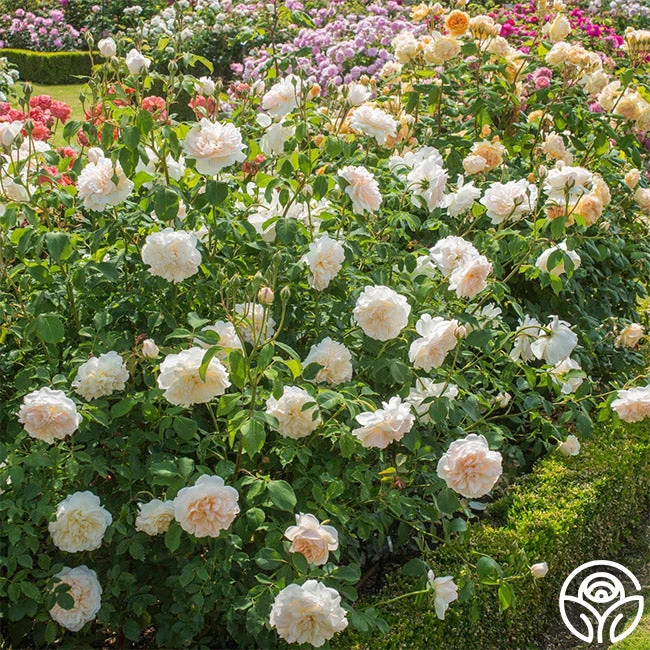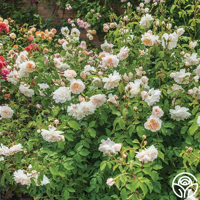 A top seller and much loved David Austin rose! The charming, peach pink cups of Lichfield Angel open to tidy, creamy apricot rosettes that emit a light, clove fragrance. With up to 110 petals on each bloom, this continually blooming rose provides large, 4”, domed, creamy-white flowers that pop against her semi-glossy, dark green foliage. Lichfield Angel is a shapely shrub, growing to be 4’ wide and 4’ tall. We love her in a cutting garden, in pots, or as a hedge as she fills out quite nicely.