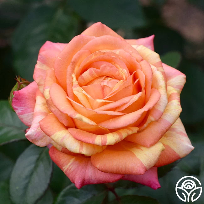 NEW INTRO 2023! This rose will remind you of a delicious peach sorbet with her swirled petals of peach, apricot, and creamy yellow. Peach Swirl features 3.5” double blooms with the most intoxicating spice and fruit fragrance. She will grow between 4-6’ tall and average 3’ in width. We love her glossy green foliage which perfectly accents her painted petals. Peach Swirl thrives best in zones 6-9.
