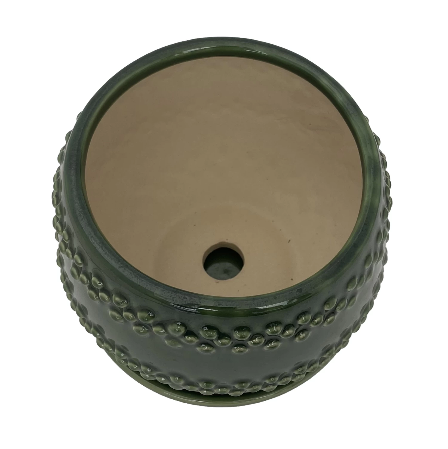 A textured style and functional pot with an attached saucer. One center drainage hole.