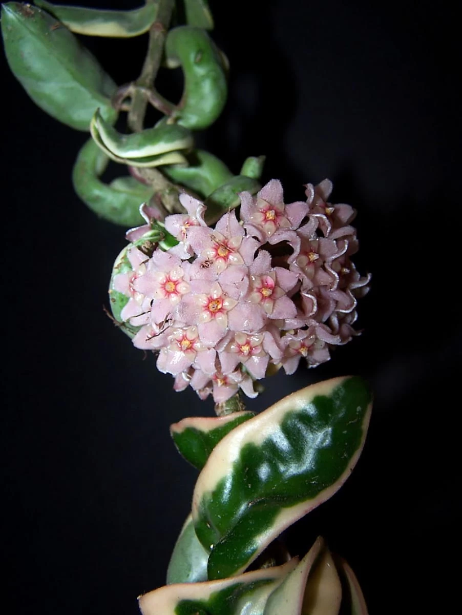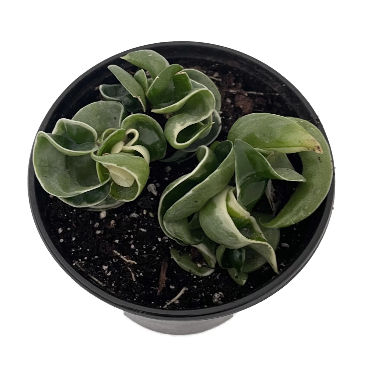 The Variegated Hindu Rope Plant is an exotic house plant native to the far east. It is rather easy to grow and can reach lengths of over 8 feet! The plant is easy to grow. It does best in a filtered light window and watered when dry. The plant prefers to be pot bound. The plant has thick, convoluted, green, pink, and white leaves, arranged on trailing, twisted stems. Small, white, waxy flowers have red centers and are very fragrant. It is related to the Wax Plant.